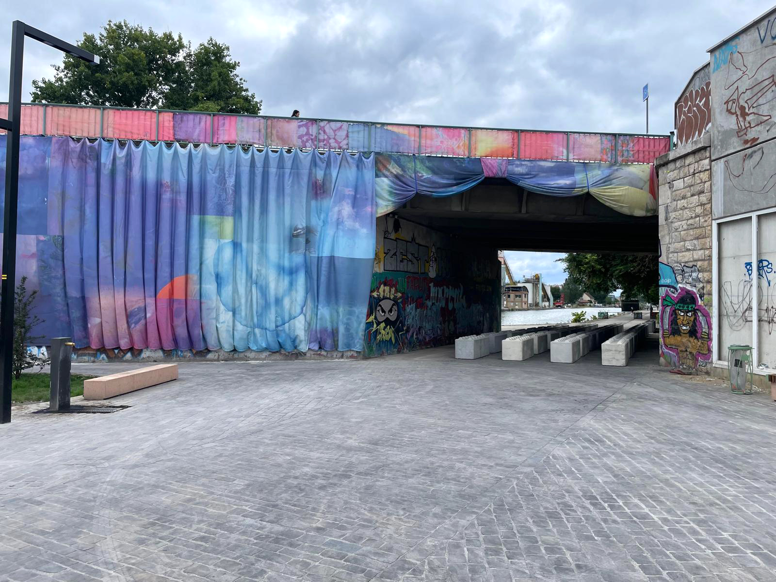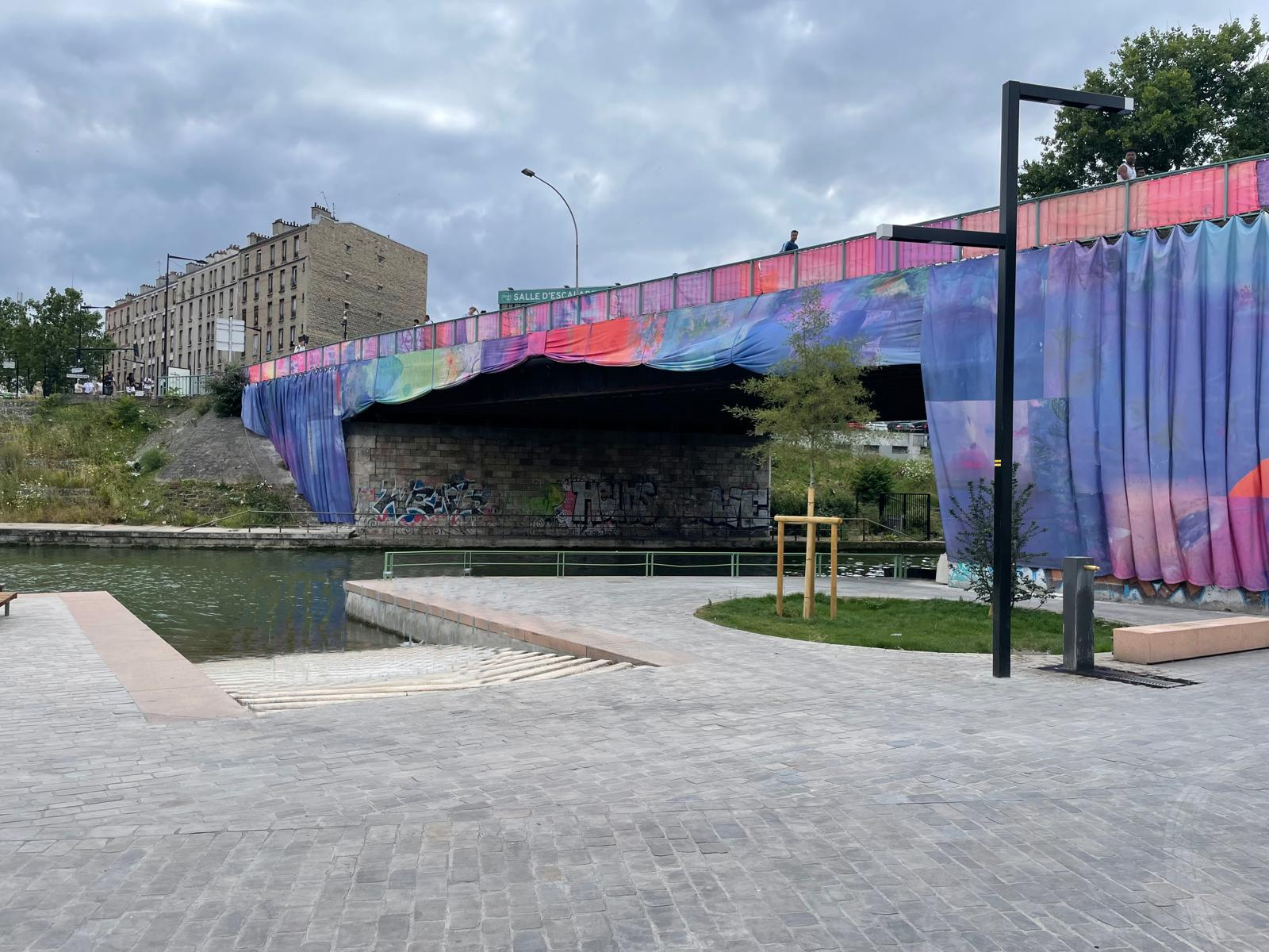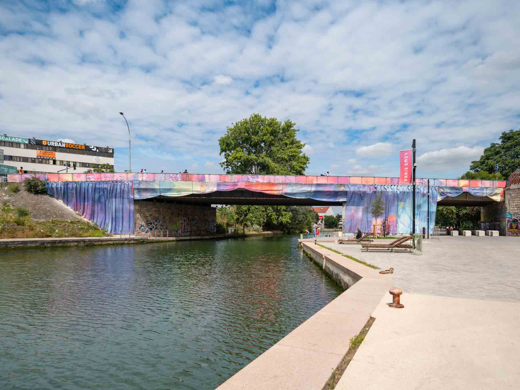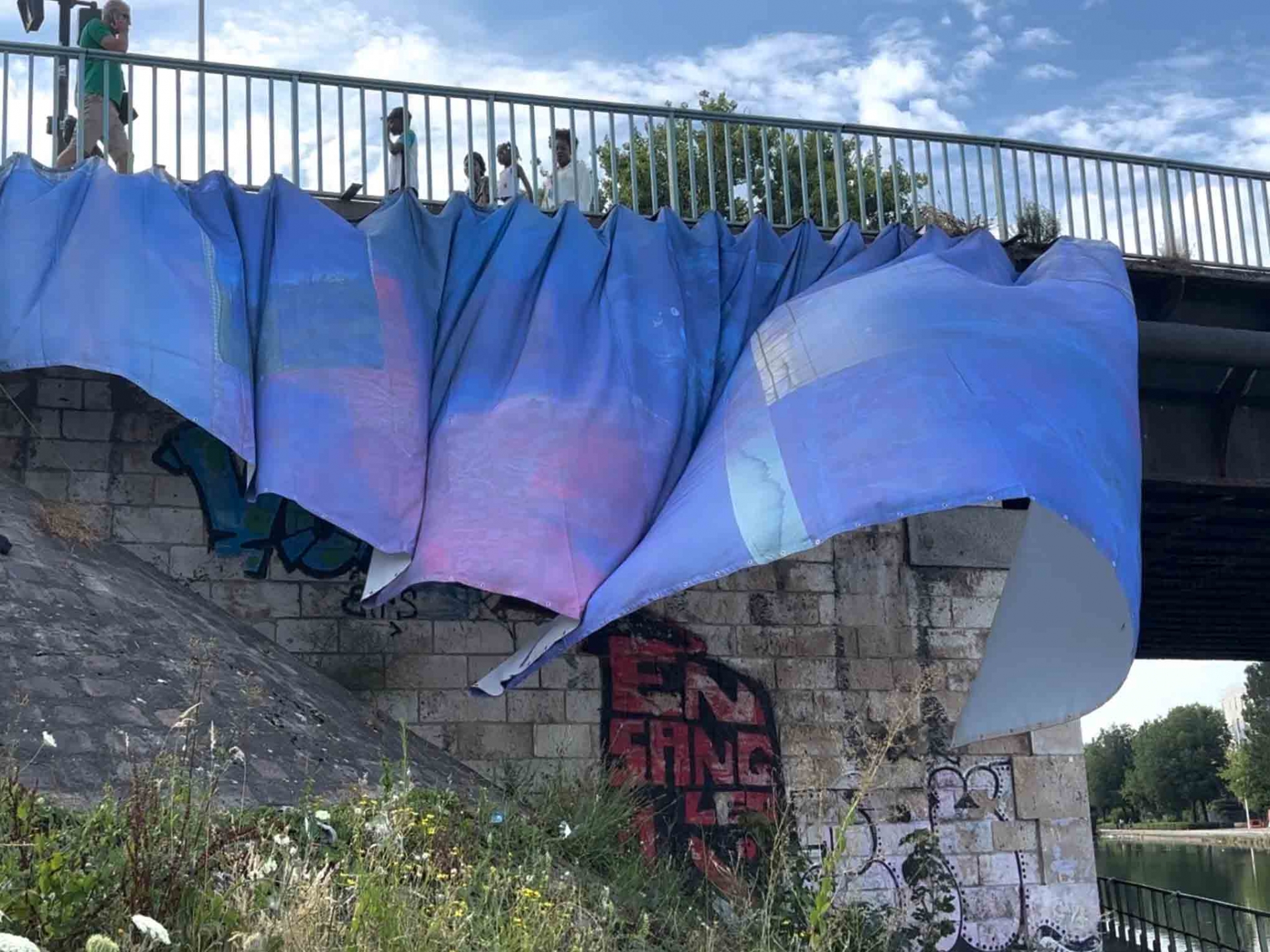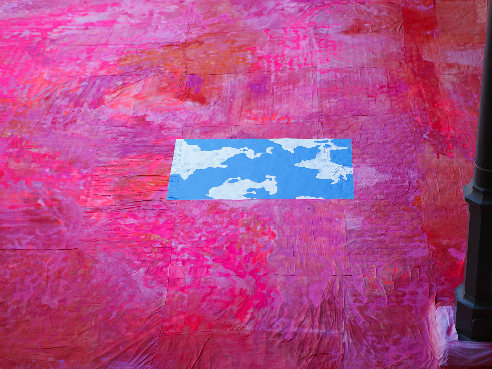 À perte de vue des lacs gelés, bâche, peinture acrylique, encres, paillettes, 150m2, Laac Dunkerque, 2022