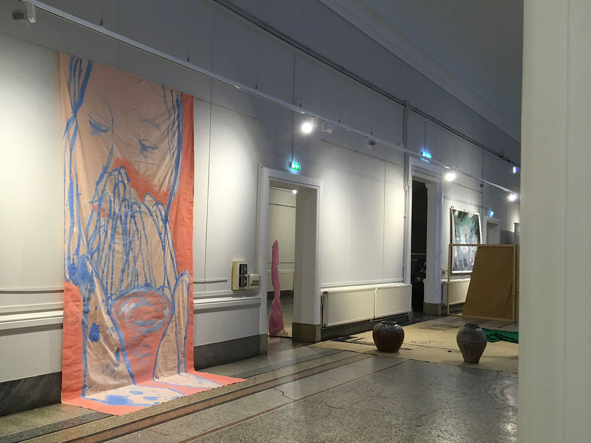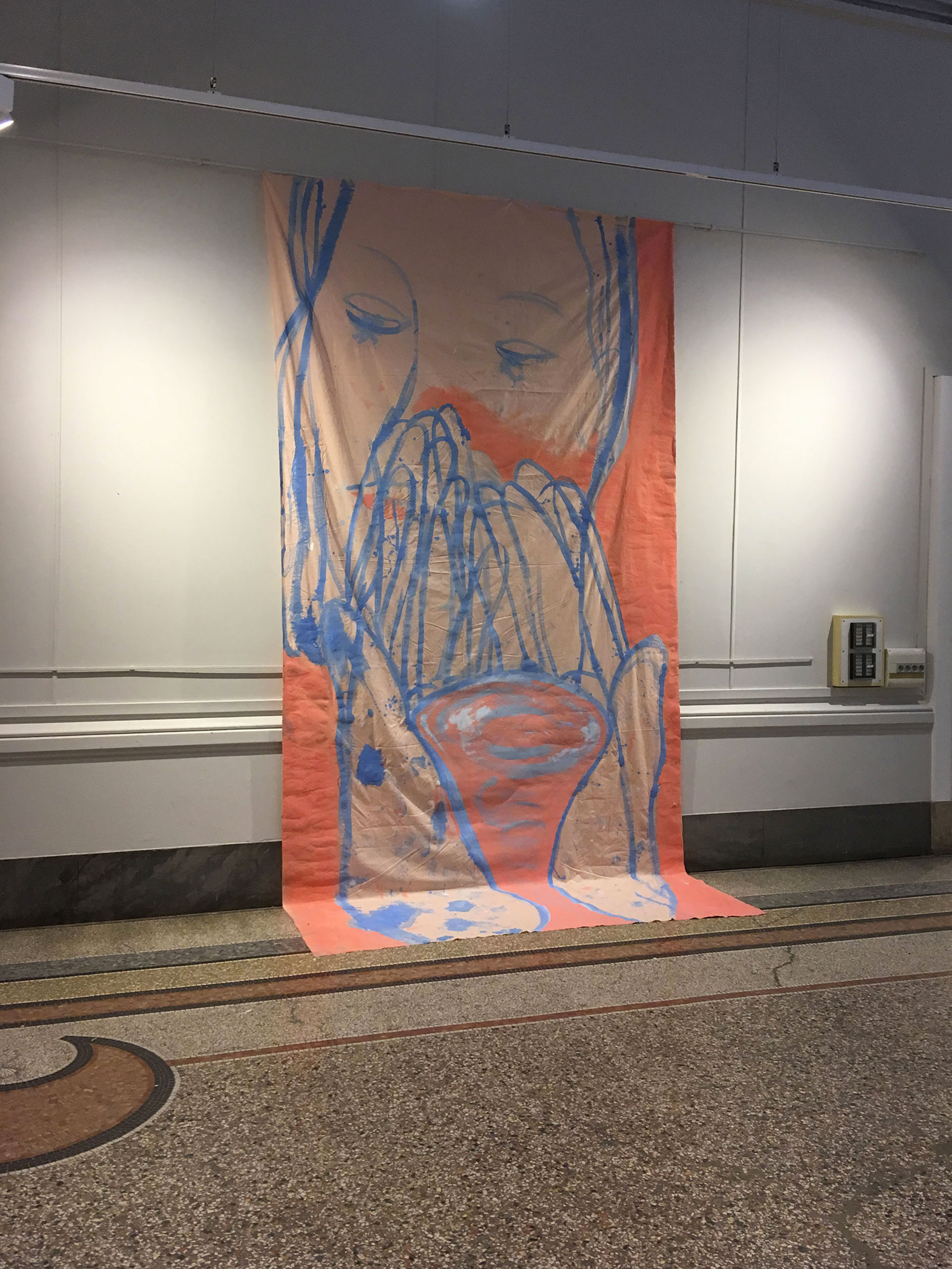 Le soleil brûle si fort que sa peau aspire l’eau, peinture acrylique, 330 x 270 cm, Institut Français de Bratislava, 2019