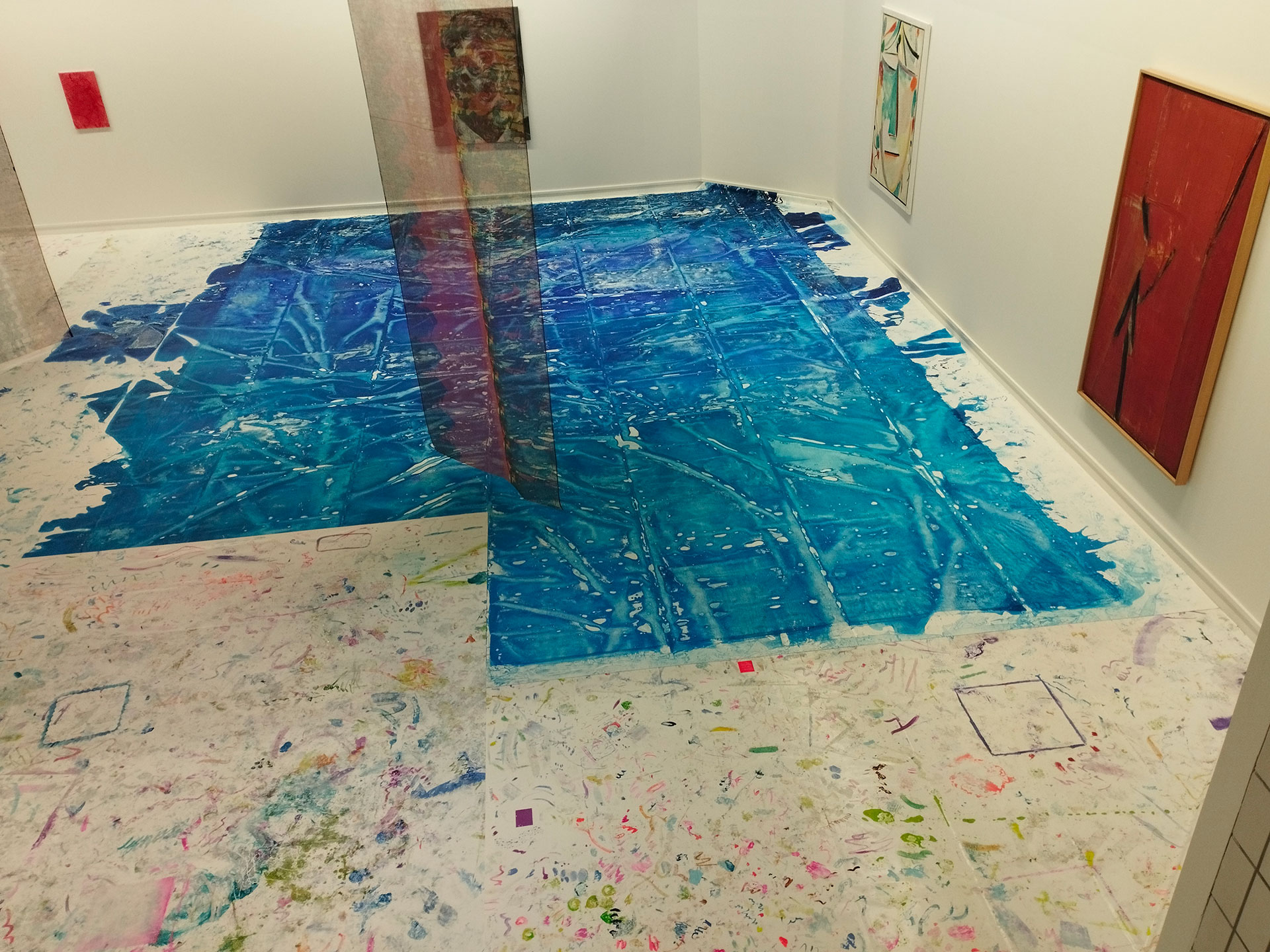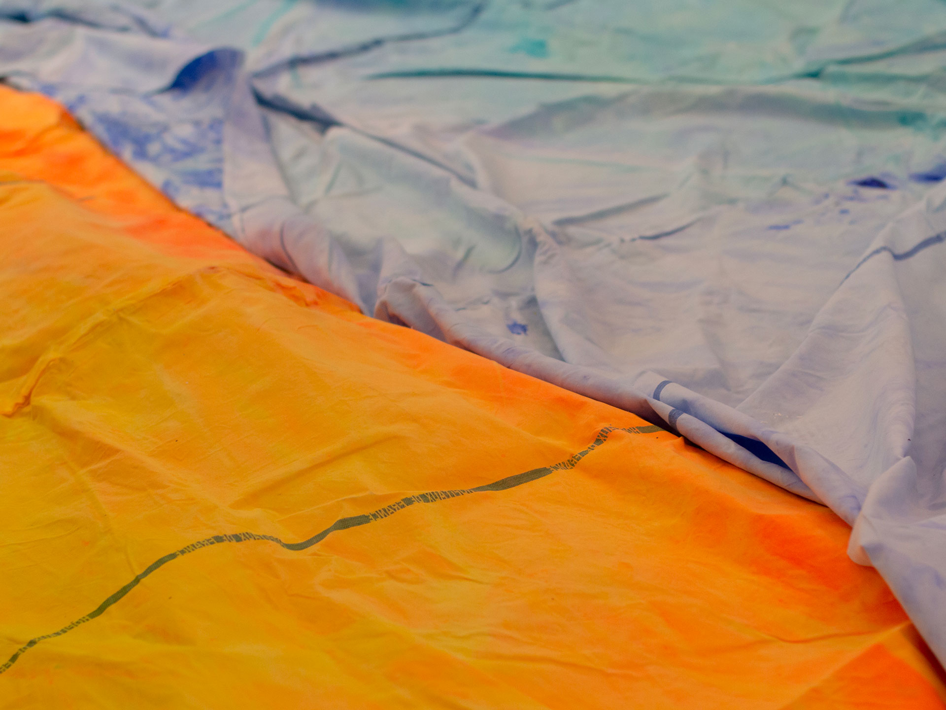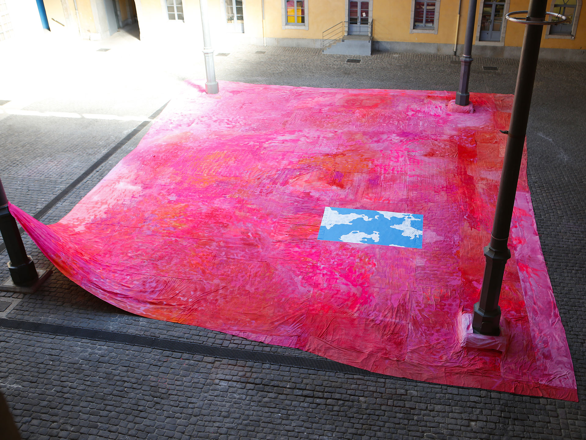 Au sol : À perte de vue des lacs gelés, bâche, peinture acrylique, encres, paillettes, 150m2, Laac Dunkerque, 2022