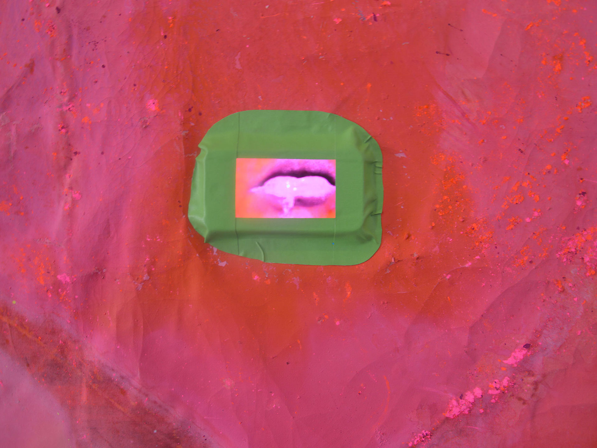 Bisous bijoux, peinture acrylique, scotch, téléphone portable, vidéo, 220 × 360 cm, Ensba Lyon, 2015